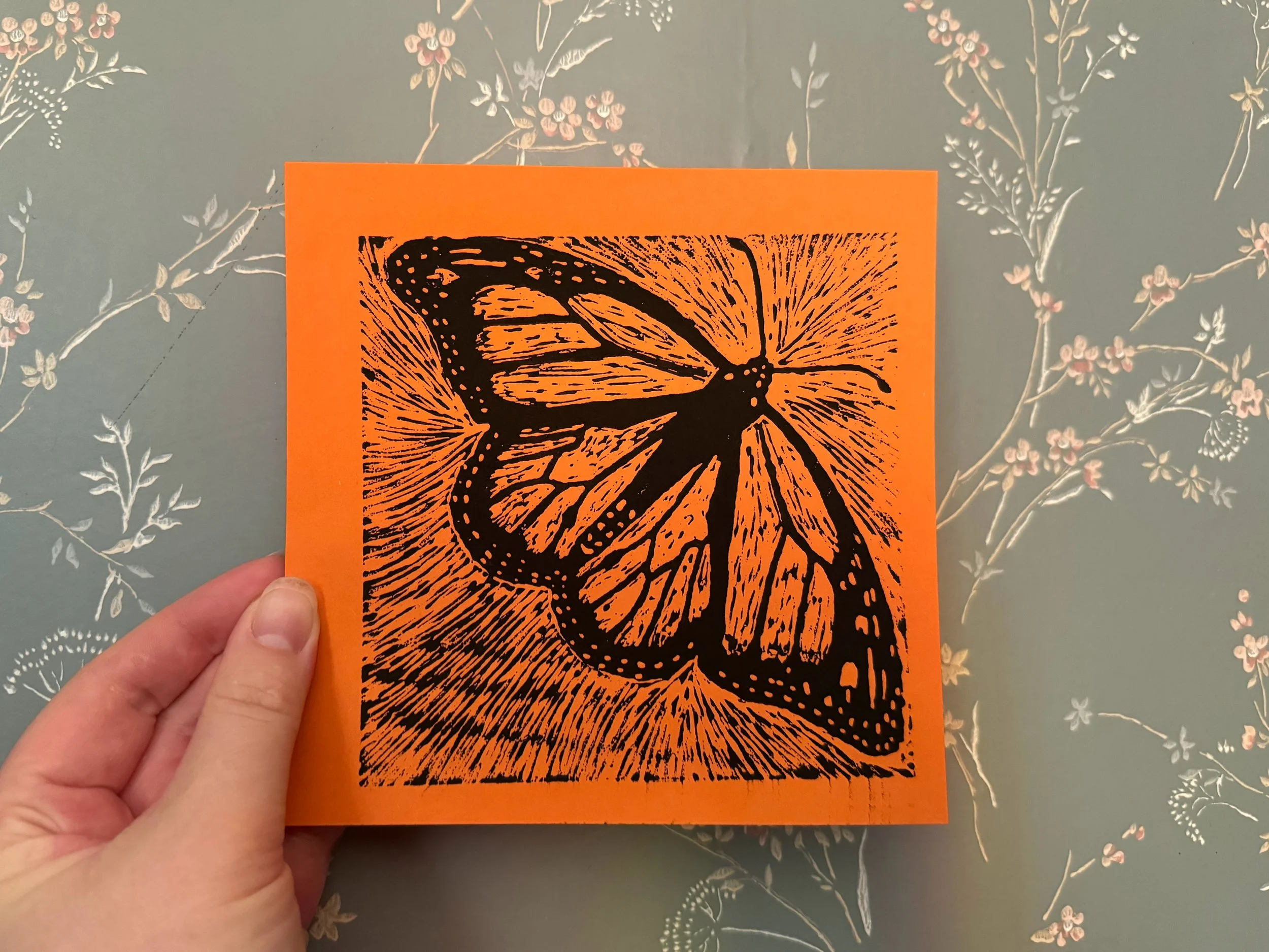 Monarchs are one of the most recognizable pollinators, especially in Michigan. I experimented with a new technique for creating this design, combining my skills in pyrography and printmaking.